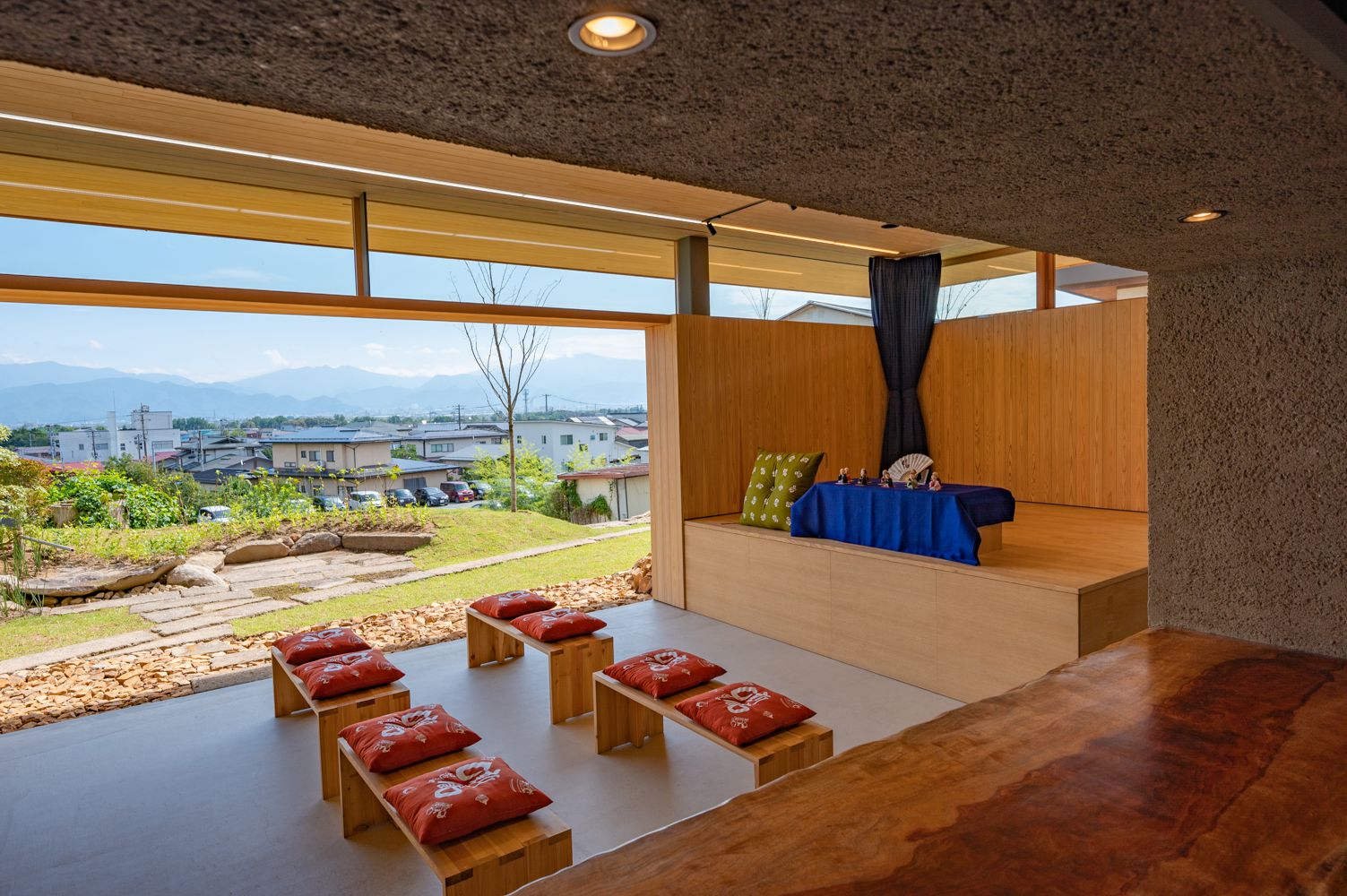 令和2年にオープンした噺館は、落語や文化を楽しめる50人ホールと、一日一組限定のゲストハウスがあります。ホールは出演者と観客の距離が近くプレミアム感が満載の空間。ゲストハウスからは山形市街が一望でき、夜空を眺めながら入浴できるバスルームやバステラスも付随し利用できます。