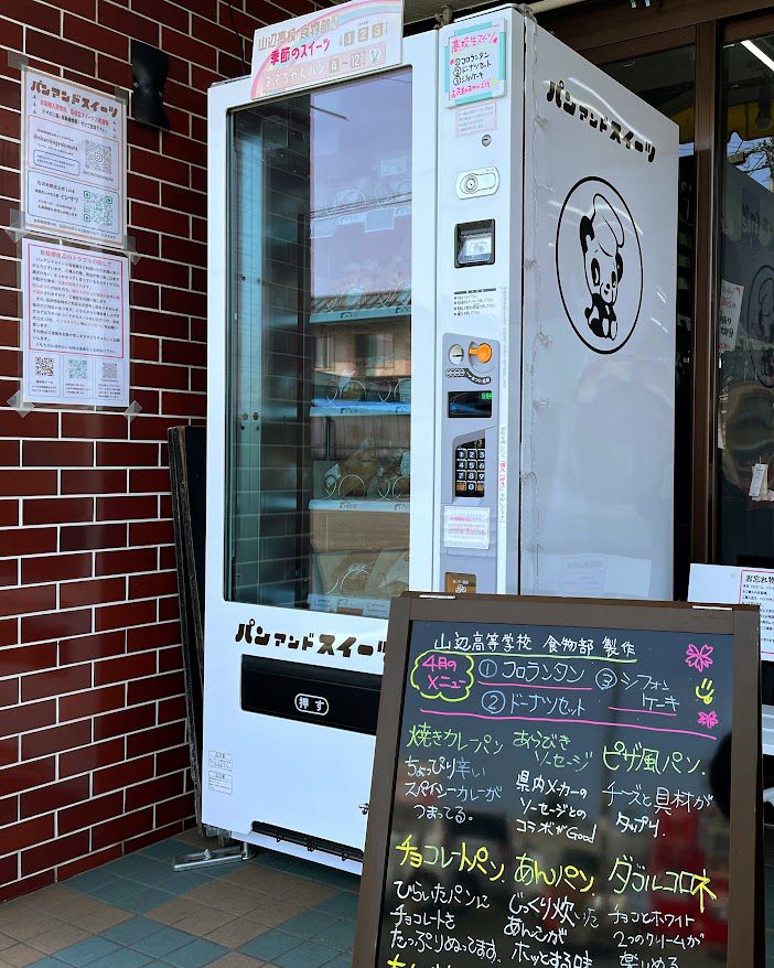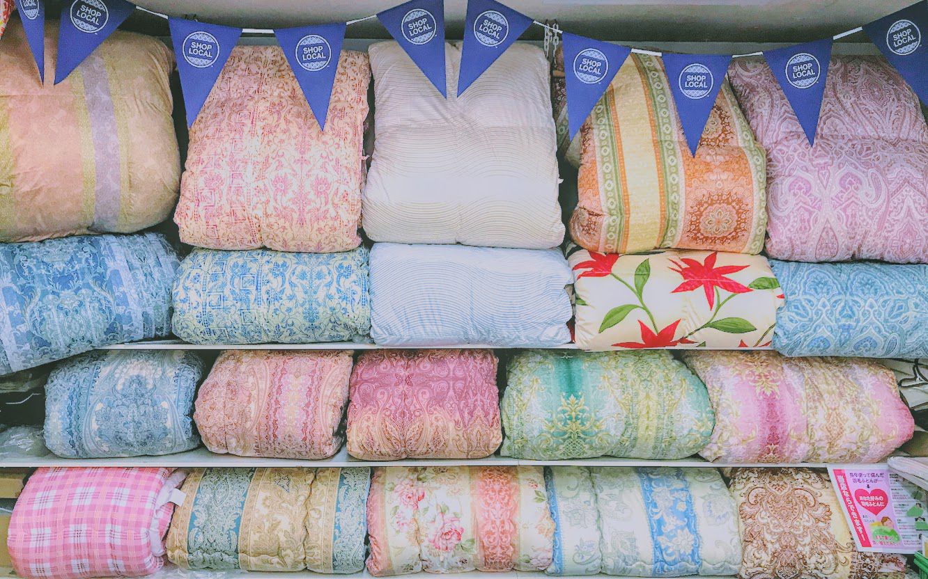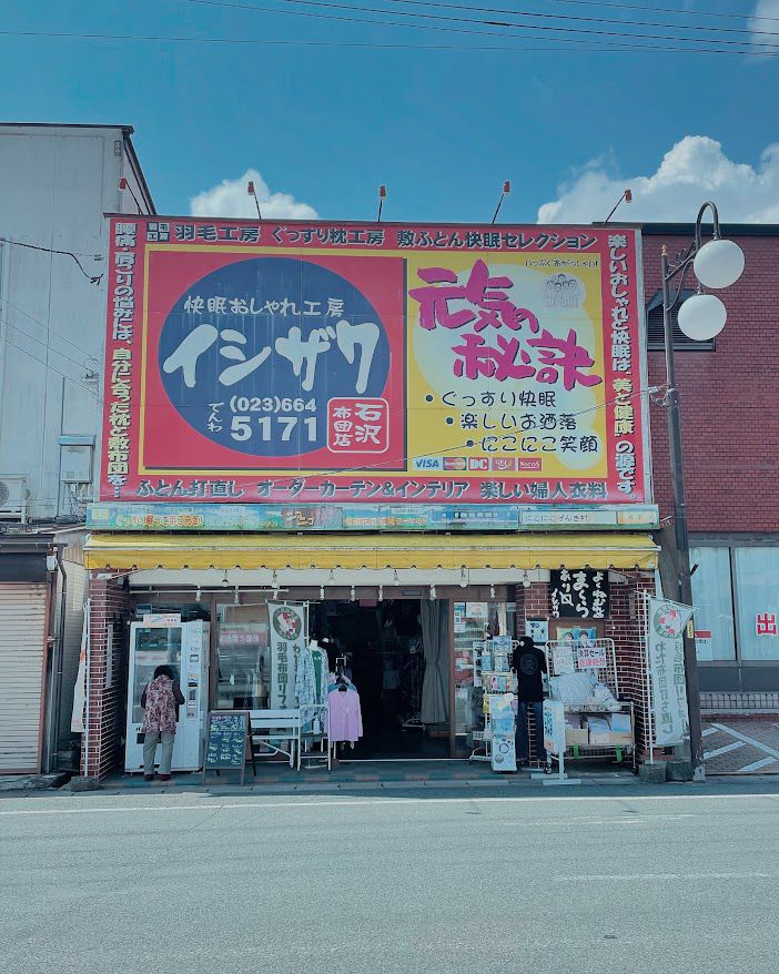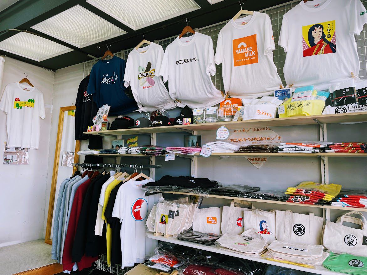 店頭には高校生スイーツが購入できるパンの自販機。店内には「やまべ牛乳」など町内外の老舗企業とコラボしたレトロなロゴのTシャツやグッズが揃うちょっと楽しい布団店です。