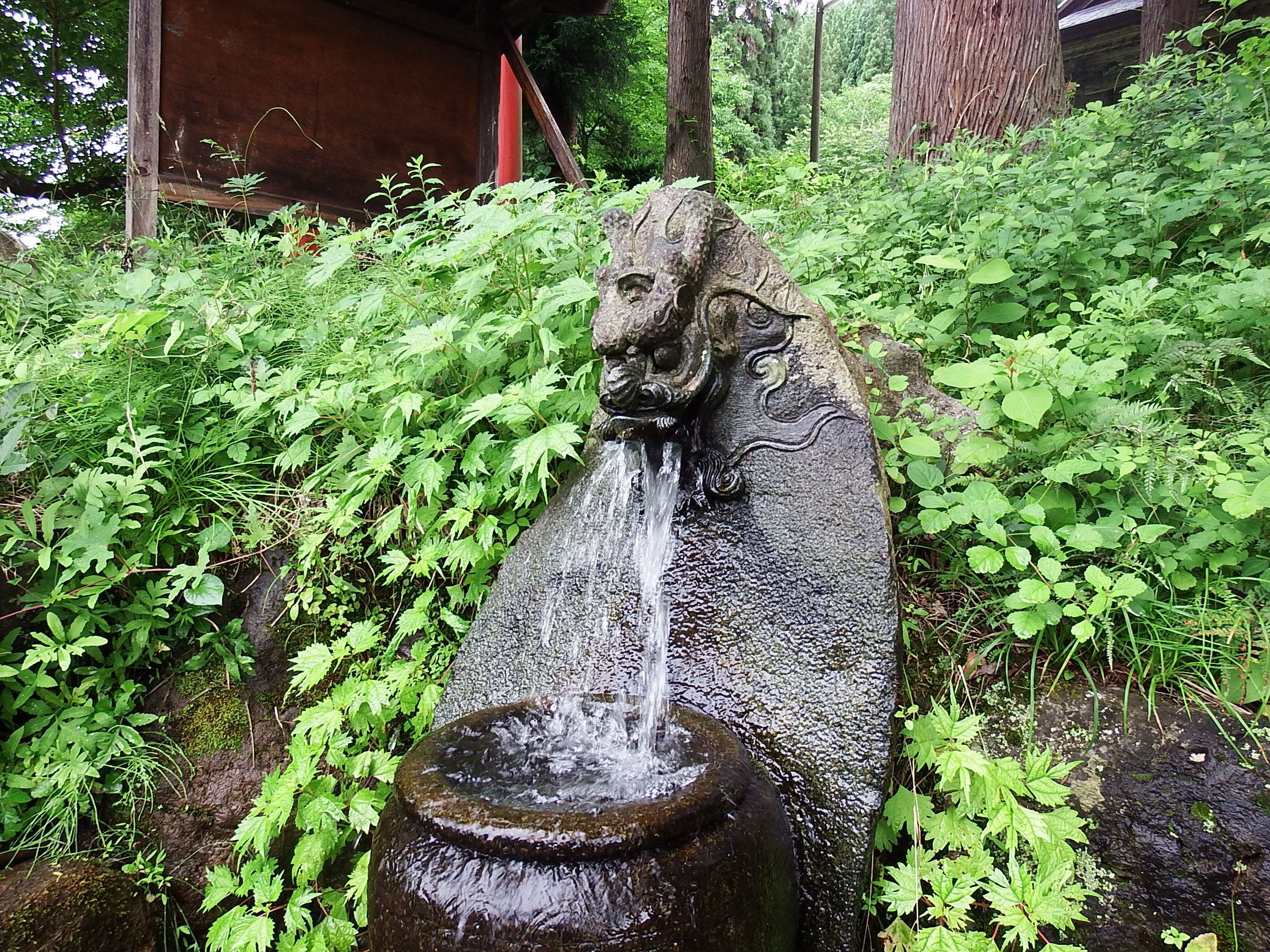 山辺町簗沢地区にある「子安神社」の境内にあり、石造りの龍神像の口からとどまることなく湧水が流れ出ています。「里の名水・やまがた百選」として認定され、良質な水質と水量を誇ります。子安神社には龍神が飛来したといういわれがあり、子宝、安産や疱瘡の神様で湧水と一緒に立ち寄りたい名所です。