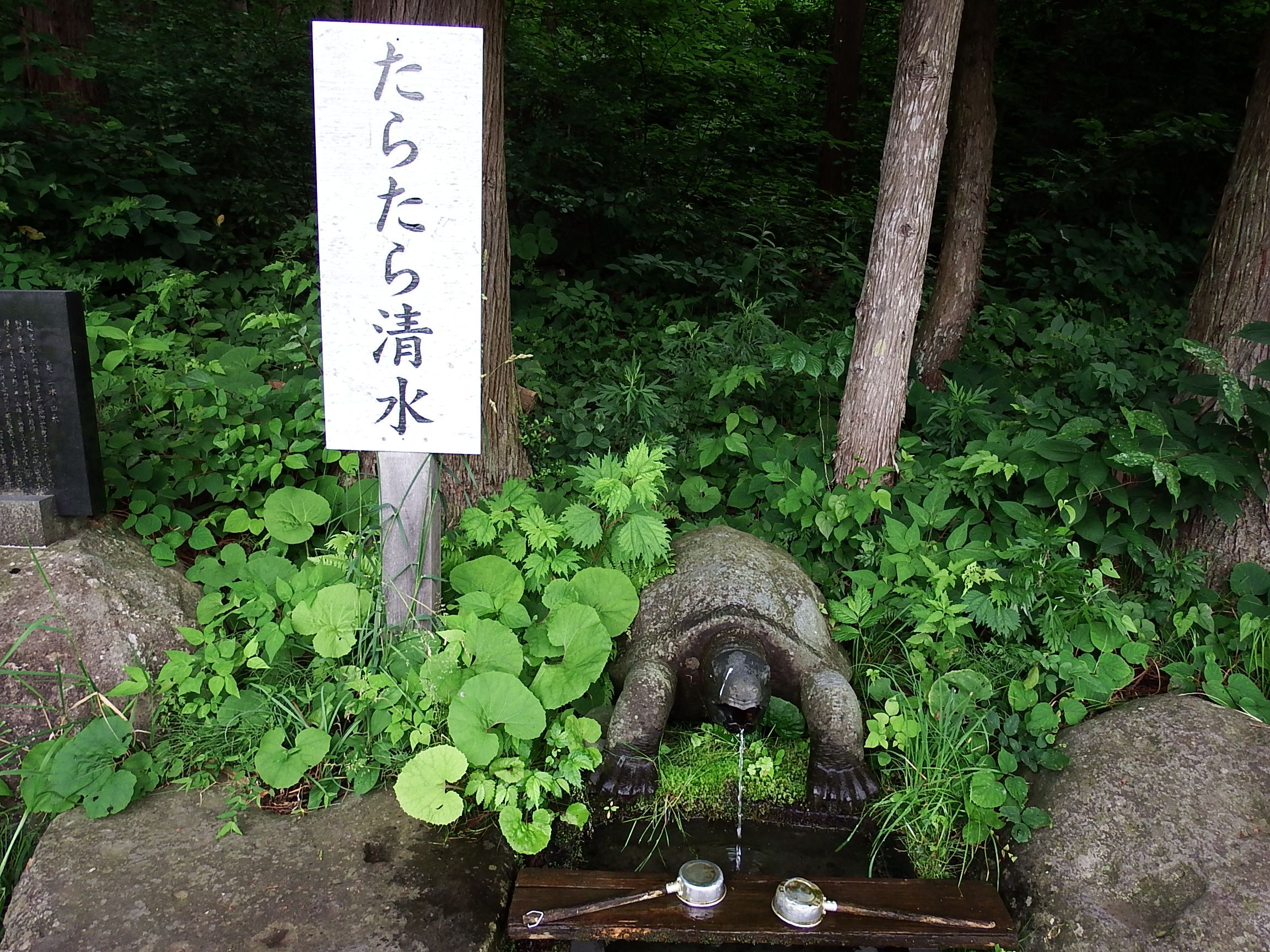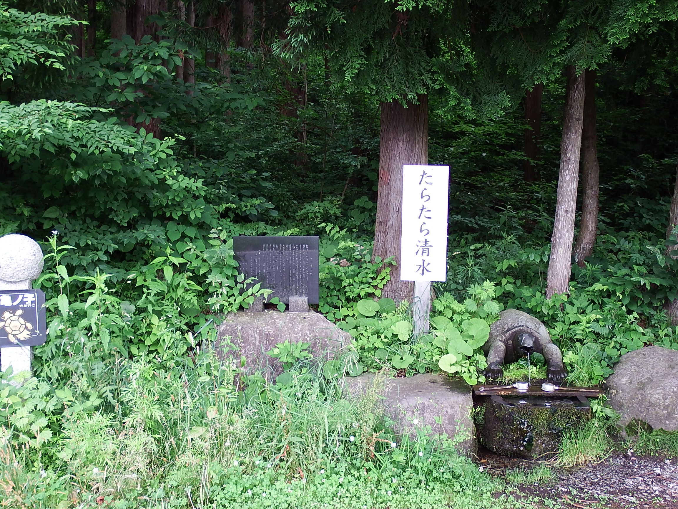 県道17号沿いにあり、「里の名水・やまがた百選」に選定されている。別名「たらたら清水」。関ヶ原の戦いと同時期におきた畑谷城攻防戦の際に討ち死にした方の末期の水として利用されたとか。道路整備とともに湧水場も整備され、「亀ノ子」の名で親しまれています。