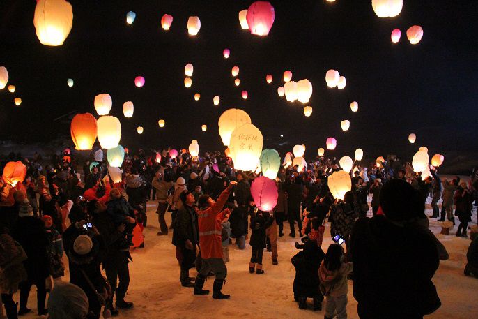 まんだらの里作谷沢に浮かぶ光と炎が、幻想的な世界に導く多彩な雪の祭典。夜空を彩る空飛ぶランタンの打ち上げ(要購入)、真冬の打ち上げ花火が楽しめます。