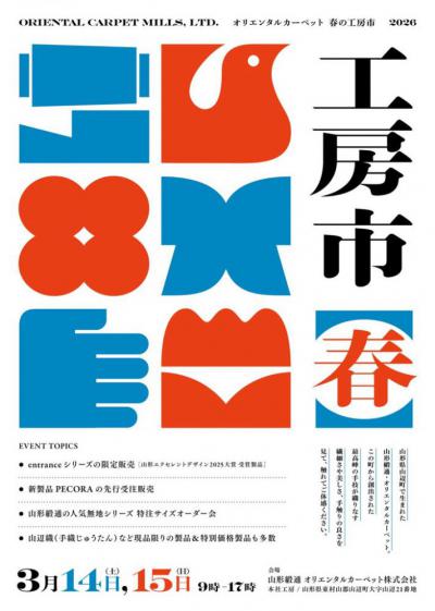 山形が世界に誇る絨毯メーカー、山形緞通(やまがただんつう)オリエンタルカーペット。本社工房にて、「春の工房市」が、2026年3月14日(土)と15日(日)の2日間開催されます!