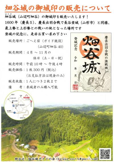 1600年(慶長5年)の「慶長出羽合戦」において、最上軍と上杉軍が激しい戦いを繰り広げた歴史の舞台、畑谷城。登城の記念となる「御城印(ごじょういん)」を販売しております。山辺町畑谷の豊かな自然と歴史に触れる旅の記念に、ぜひお買い求めください。
